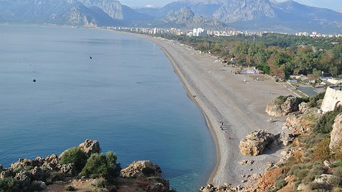 Анталья — пустыня. Со скалистого обрыва в парке Ататюрка под персиковым небом открывается захватывающий вид на абсолютно безлюдные пляжи. Аллея, тянущаяся вдоль берега, окружена пляжными кафе. Вид постапокалиптический: заколоченные двери, разбитые стекла, сваленные в кучу пластиковые стулья, мусор в холодильниках… Здесь вообще никто не понимает ни по-русски, ни по-английски, кроме в изобилии валяющихся на гальке бездомных собак и кошек. Такой Шарик и привел меня к единственному на всем пляже открытому кафе.