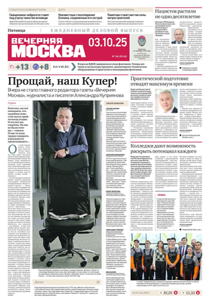 «Вечерняя Москва» — ежедневная российская вечерняя газета, старейшее из вечерних изданий в России, учрежденное в 1923 году. Выходит пять дней в неделю, кроме субботы и воскресенья. Отличается тем, что рассказывает о событиях еще не завершившегося дня. Оперативно освещает хронику и особенности жизни Москвы, охватывает все слои общества и большинство профессиональных и возрастных групп читателей.Издание представлено тремя выпусками – утренним ежедневным, вечерним (выходит три раза в неделю), еженедельным (выходит по четвергам).