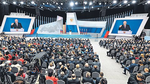 Если быть точным, Владимир Путин вышел не в полдень, а в 12:20, то есть с задержкой, какой до сих пор при оглашении послания не было.