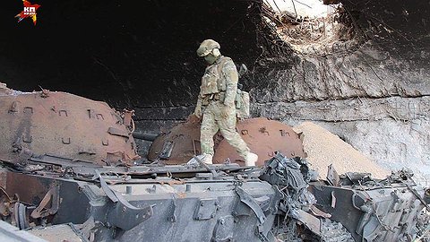 Неподалеку стоит большой бетонный ангар. Внутри — три сгоревших игиловских танка. Сверху — огромная пробоина в бетоне как пример филигранной работы российских летчиков. Но координаты этого ангара передавали как раз с земли.
